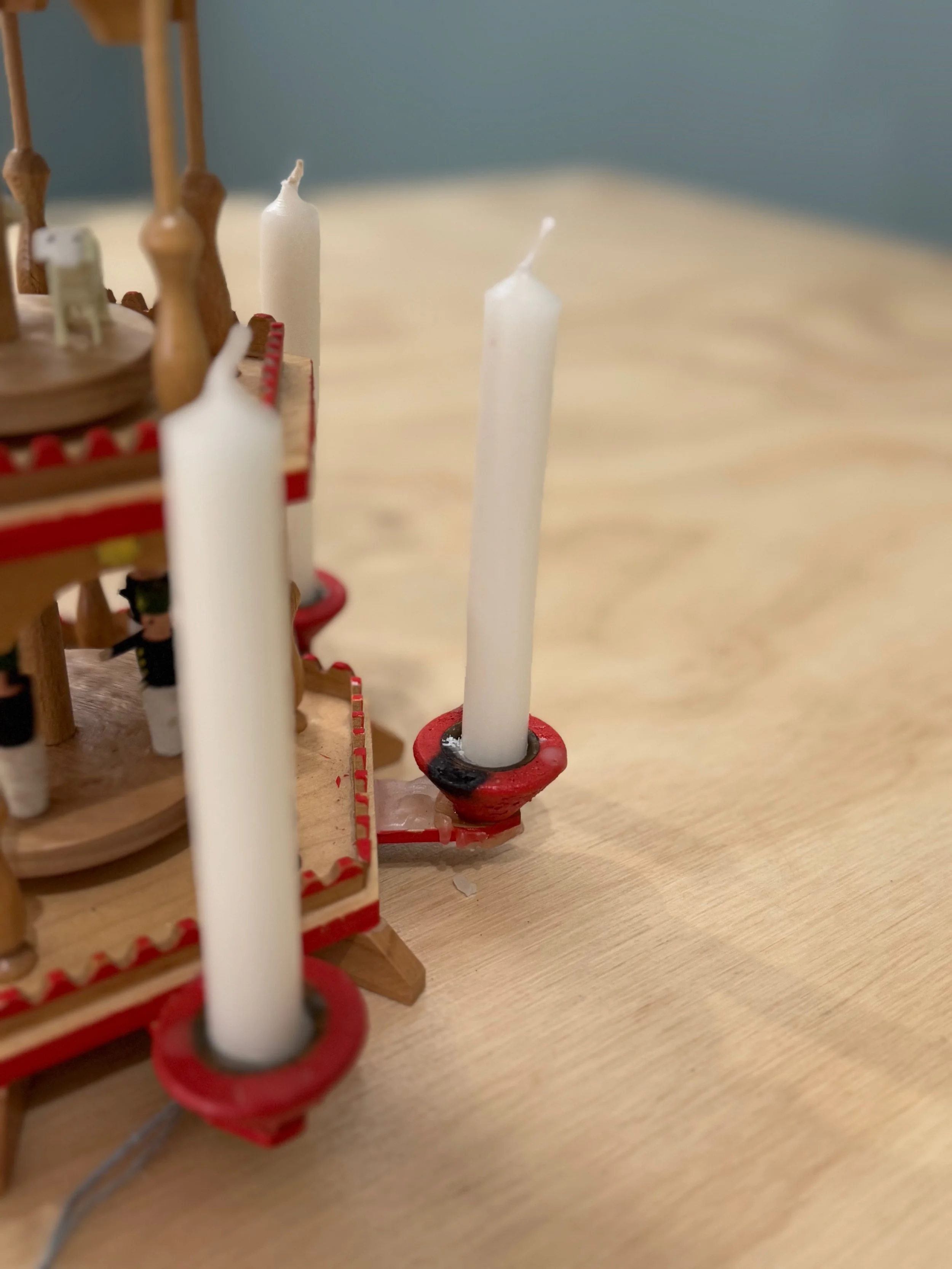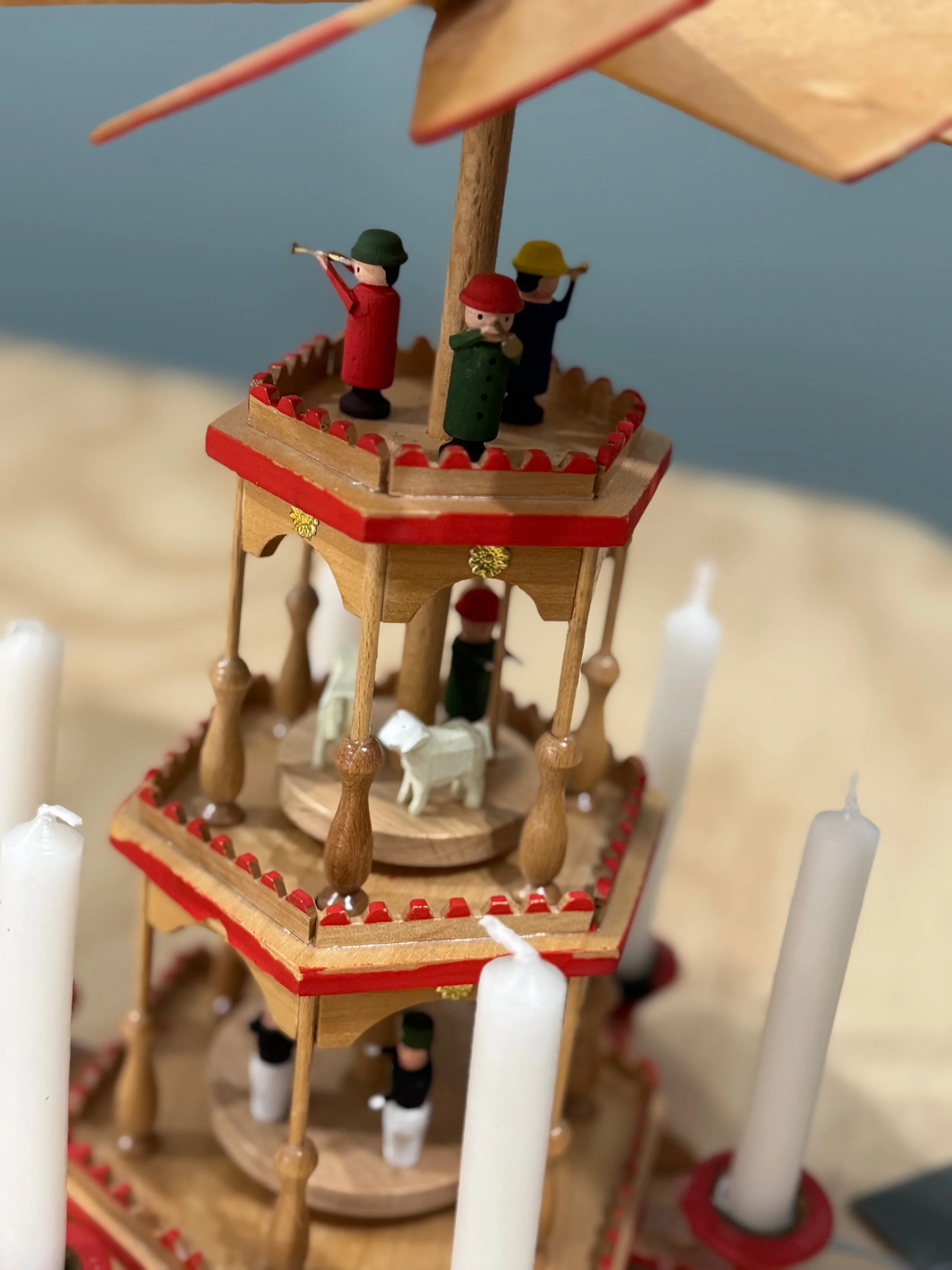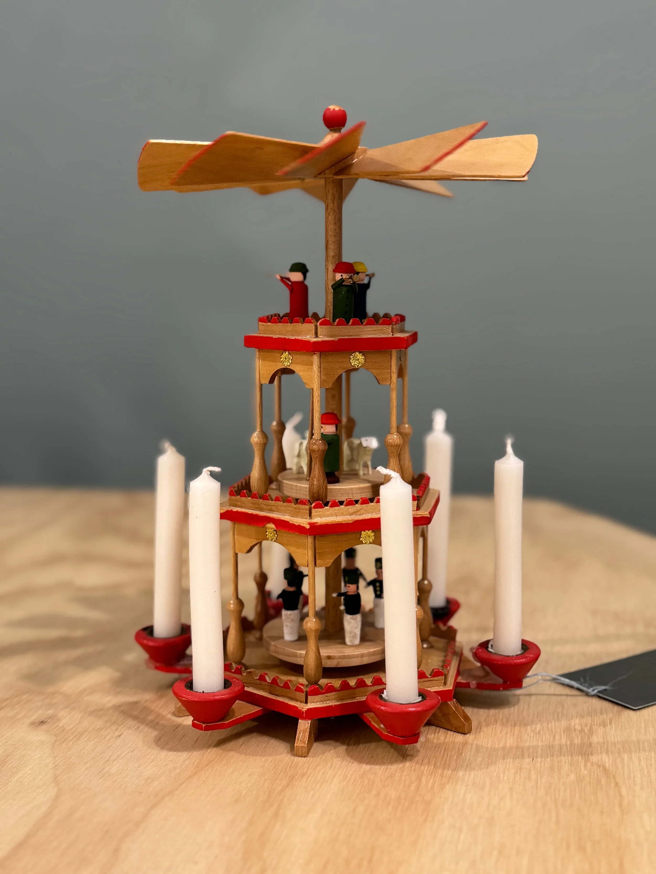 Vintage hand-painted wooden 3-tier Christmas pyramid by Erzgebirge. Includes six candles the original box. When the candles are lit, the heat rises and moves the fans, spinning the bottom two tiers. Features trumpeters, shepherds, sheep, and soldier figurines. Made in Germany.