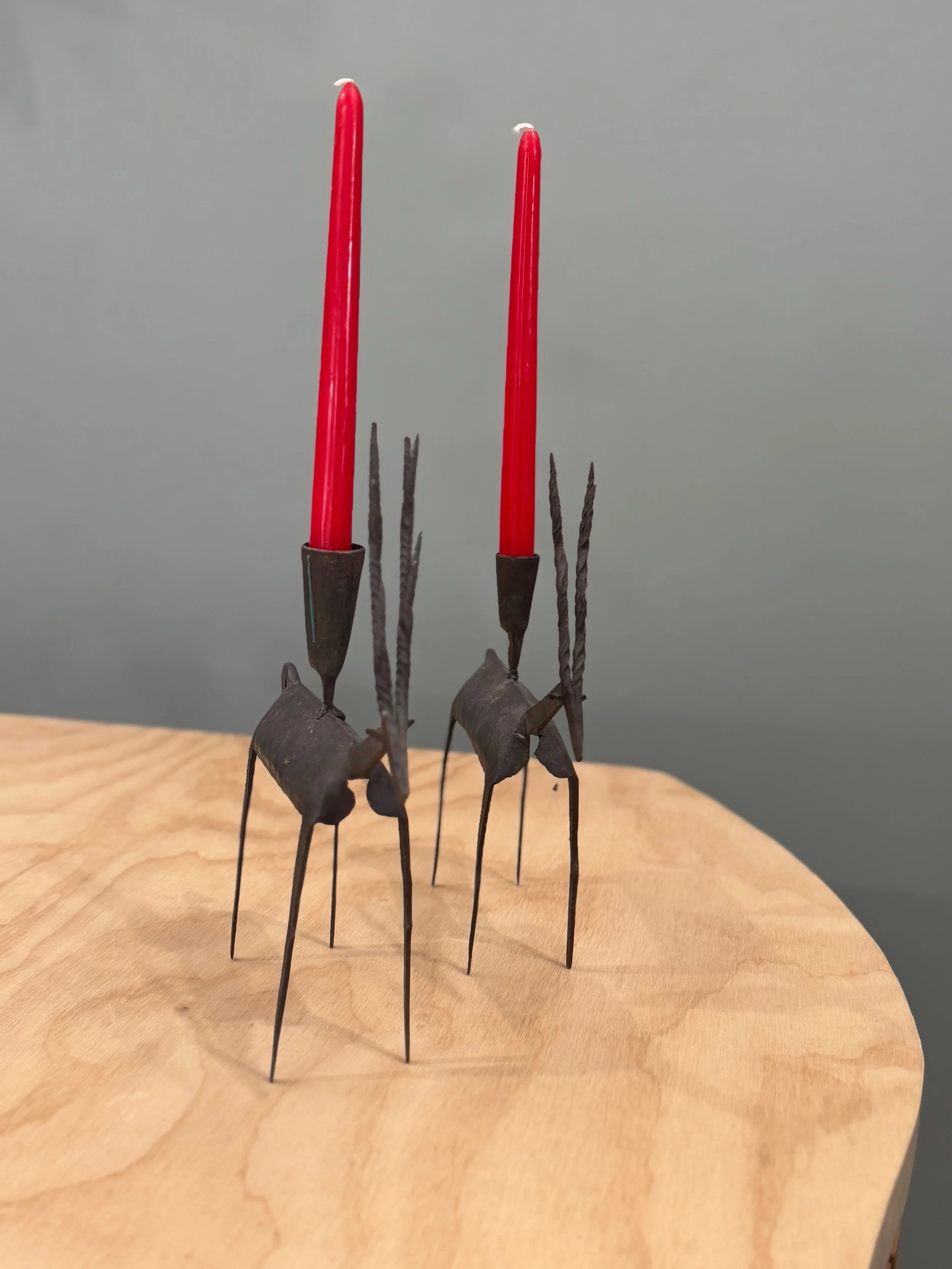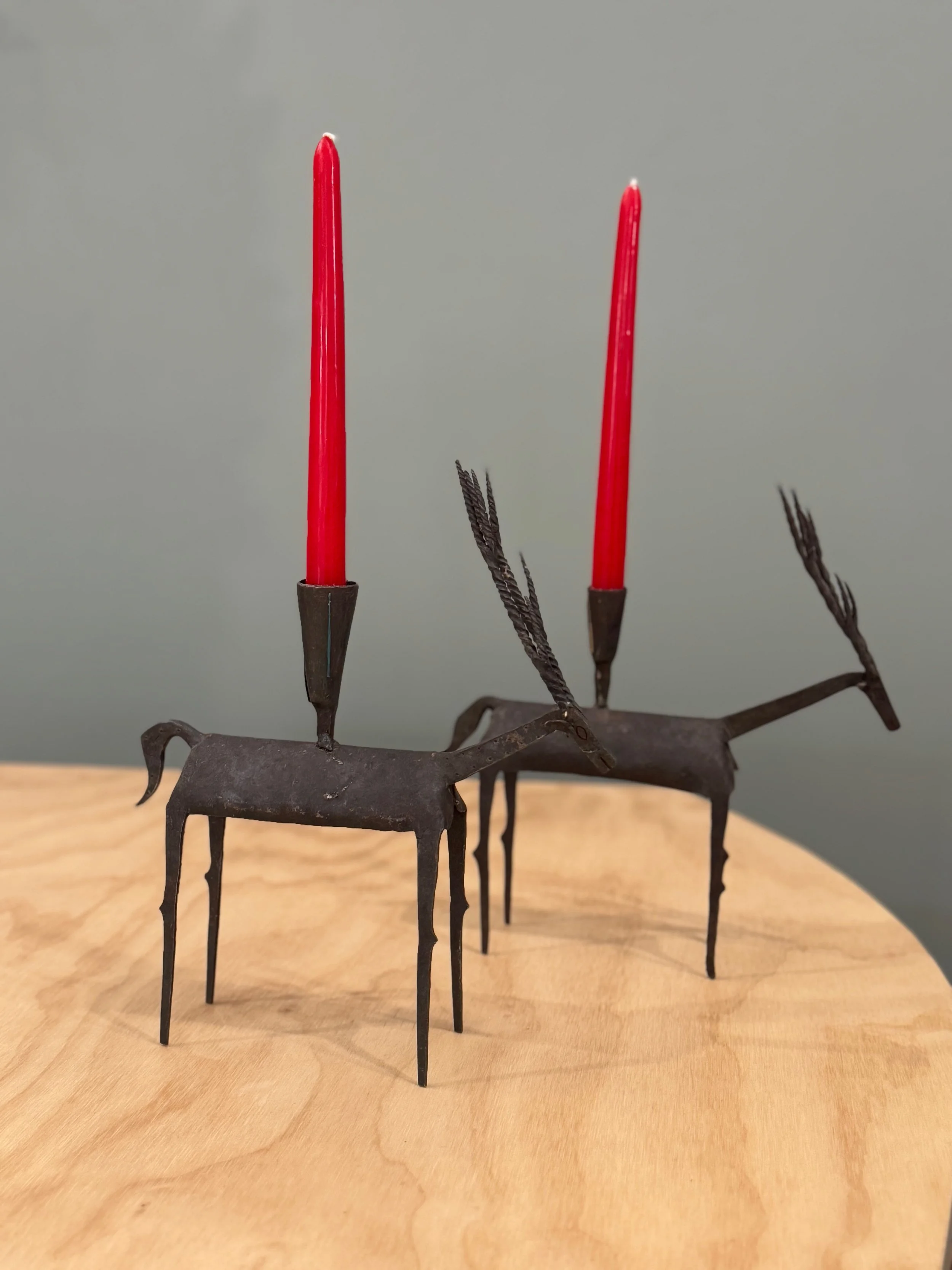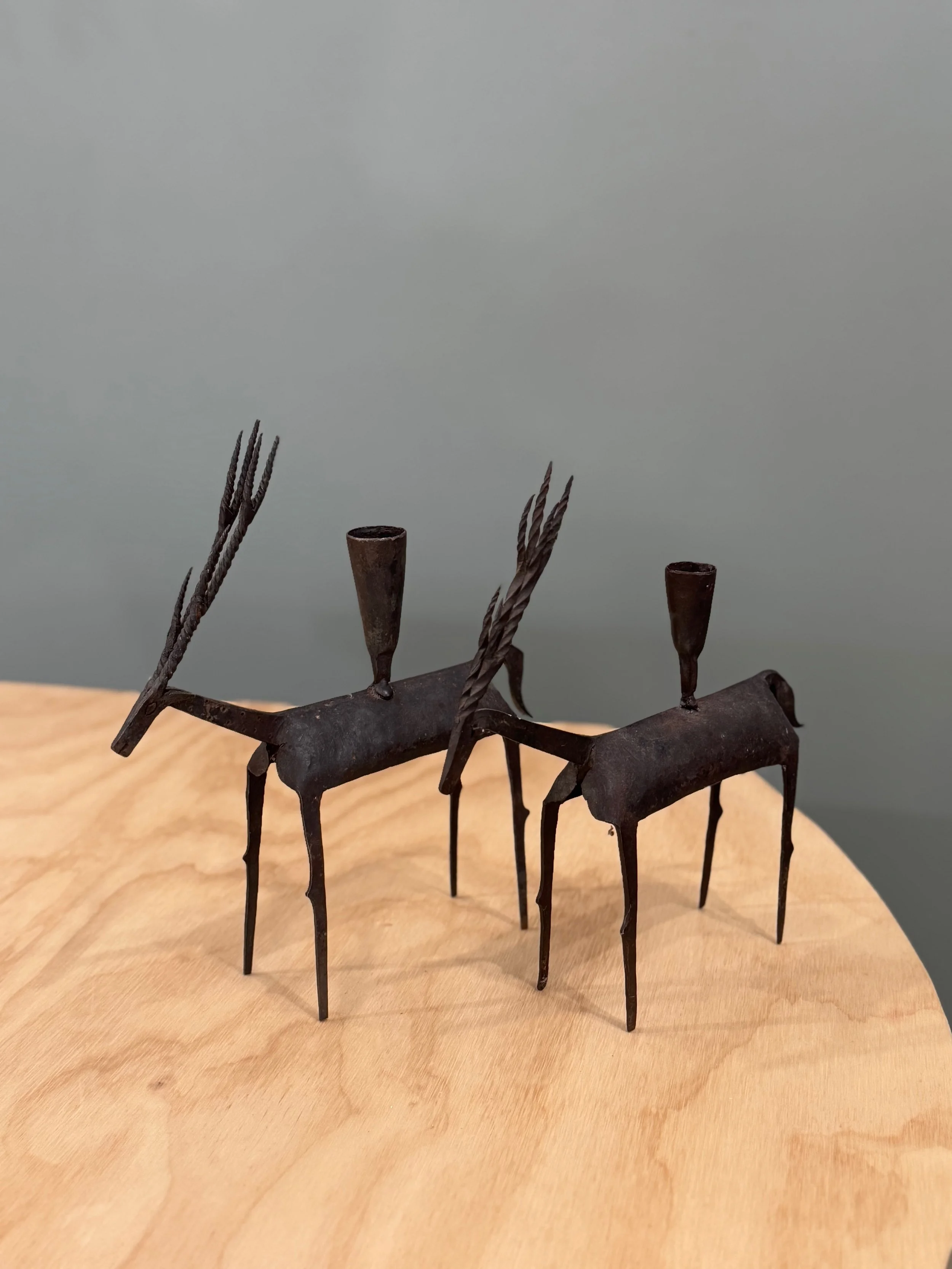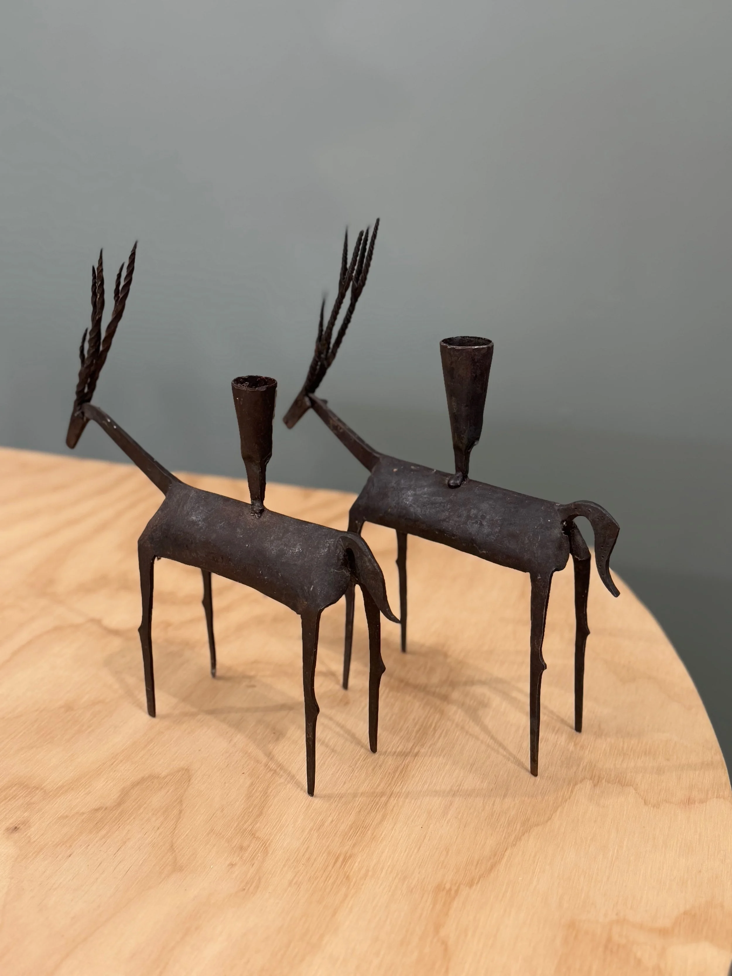 Gifts › Vintage Brutalist Hand-Forged Iron Candle Holders Image 1 of 4 Image 2 of 4 Image 3 of 4 Image 4 of 4 Vintage Brutalist Hand-Forged Iron Candle Holders $184.00 Get notified by email when this product is in stock. Add To Cart Added! Vintage pair of hand-forged brutalist deer candle holders. Patina consistent with age. Please see photos for details. Vintage pair of hand-forged brutalist deer candle holders. Patina consistent with age. Please see photos for details. Reviews Reviewer Name Review Date Star Rating Description Posted on Etsy Product Show More